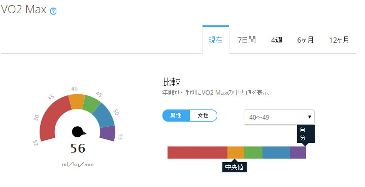 「VO2 Max」最大酸素摂取量というらしいですが。先日の金沢城下町市民マラソンを走った後に最高値になりました。