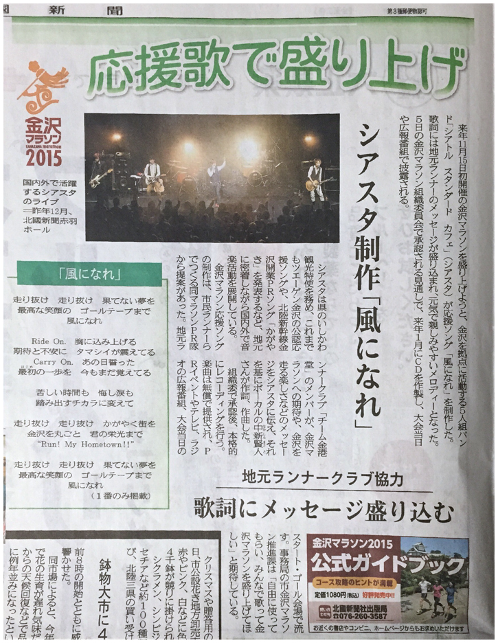 オリンピックでもニュースのシーンになるとテーマソングがかかるように、金沢マラソンもやはりテーマ曲があったらいいな。と思っておりまして。色んな話しのなかからシアトル・スタンダード・カフェのボーカル中新さんとも、交友がありましたから、彼と相談し、そしてチームのメンバーからマラソンの応援ソングにするならどんな歌詞が良いということで、色んな言葉を出してもらい、それを中新君に私、素敵な曲(歌詞)にしてもらいました。曲もほぼ出来上がっているので、これからレコーディングがあり、そして来年早々には曲の発表もあると思います。楽しみです。チームのメンバーも製作に少しでも携われ、また金沢マラソンに向けての意気込みも更に増したことだと思います。