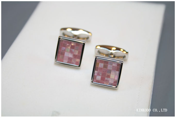 白やピンクの蝶貝をモザイク状に配置して上品はなカフス。Simon Carter 【サイモン・カーター】スクエア蝶貝埋め込みカフス。¥11,000+税