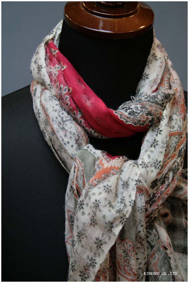 ウール100%ですが、透かしが入るような薄手のものです。春先、もしくは今からでもちょっと温かな日に衿元を春っぽくすると良いかも知れません。それぞれの画像をクリックして頂きますと、更に詳細のページにリンクされます。中国製ではありますが、エスニック調のいい雰囲気出ていますし、お値段もお手頃です。¥6,800+税 是非気持ちだけでも春に。