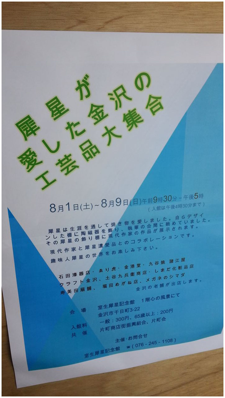 さて、全く関係ありませんが、本日から室生犀星記念館にて「犀星が愛した金沢の工芸品大集合」というイベントが開催されております。