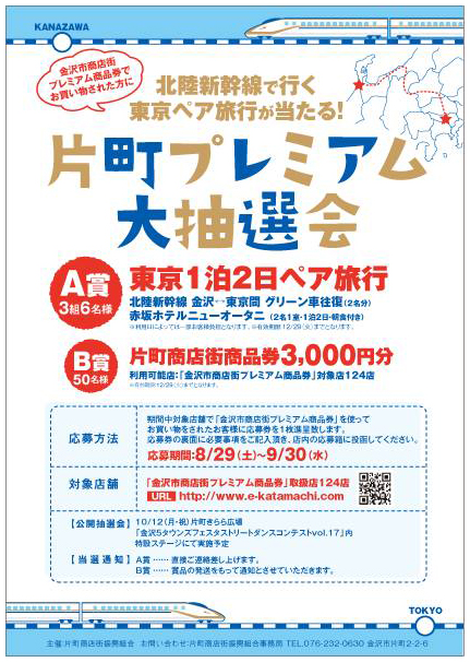 また片町でプレミアム商品券をお買い上げになりますと、抽選で北陸新幹線グリーン車で行く宿泊券や、更に3,000円の片町商品券が当たる抽選にもご参加できます。お使いになるには片町商店街で、更に金港堂でお使い頂ければ幸いです。よろしくお願いいたします。