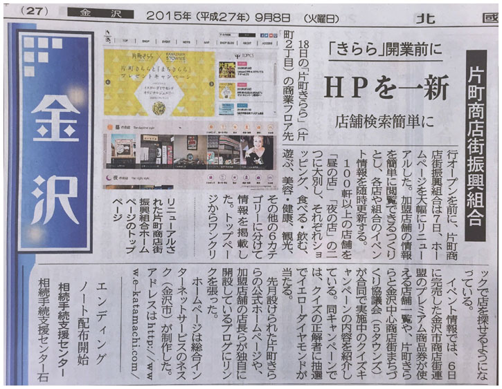 何ヶ月もかけて構築しておりました商店街のホームページが完成しました。本日北國新聞社さんに取材を受けたものが掲載されております。