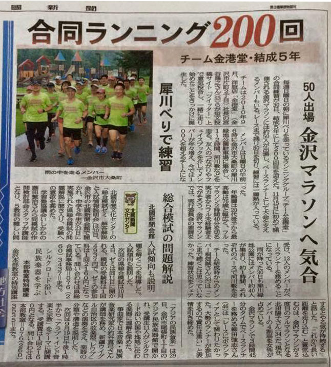 出演前の3人で自撮り。1人変な顔をしていますが。チーム金港堂結成以来5年間。初期メンバー3人です。5年の間に色んなことがあったと思い出しますが、一緒に走り始めた時は「金沢マラソン」など開催されるとは思っていませんでした。チームから約50名が金沢マラソンに参加しますし、14名程がペースランナーとして参加します。