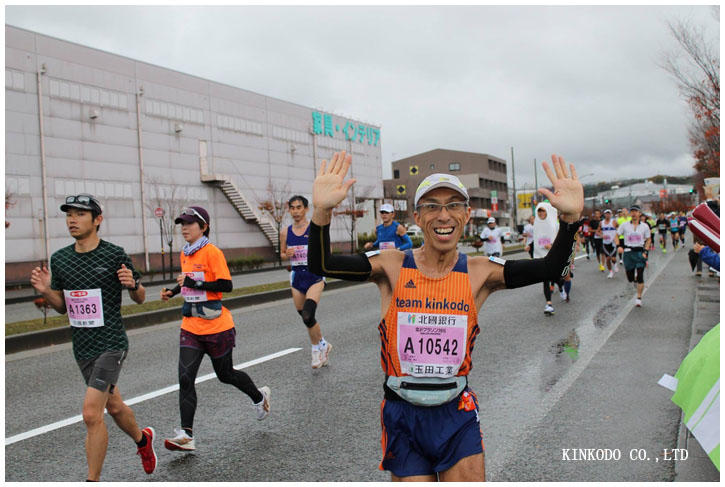 若干上り基調なはずですが、上っている気がせず、そのまま進み。左折をして、山側環状道路へ。金沢マラソンの最大の山場といえば山場。ここを上りきれば、もう上りは無し。左折した途端に目に飛び込んできた左右の歩道に溢れんほどに立っている応援の方々。自宅に近いですしよくこの道を通りますが、日頃は人がまばらにしかいない所。いつもとは違う圧巻の景色。感動しました。今「金沢マラソン」を走っているのだな。そんな実感。200メートルもあろうかという上り坂を駆け上がり、そこから左折し、このコースの最高地点(約67m)に向かいます。ここでも多くの声援を受けます。最初にお会いしたのが金沢倶楽部の山田社長。社長のブログにも私のことを書いて頂きました。その後エルモの着ぐるみを着て応援してくれるジム仲間。そして当店のホームページのデザイン等をお願いしているタムラデザインの田村社長。彼とはハイタッチをして進みます。「雨降ったら応援行かないかも知れないわ」と言っていたのに、小雨がまだぱらつく中、大きな声で応援してくれている彼を見て嬉しくなり多分20センチくらいはジャンプしたのではないかと思います。体力消耗。