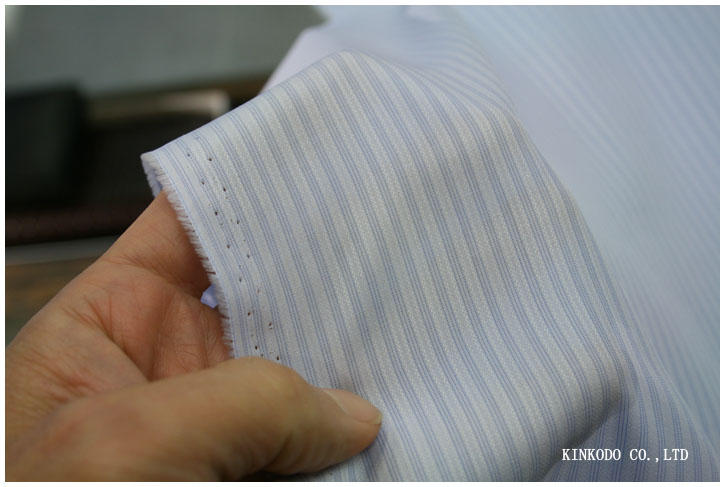 薄いブルーにブルーの細ストライプ。間に繊細なドビー柄 170番手双糸 アルモ社製 綿100%