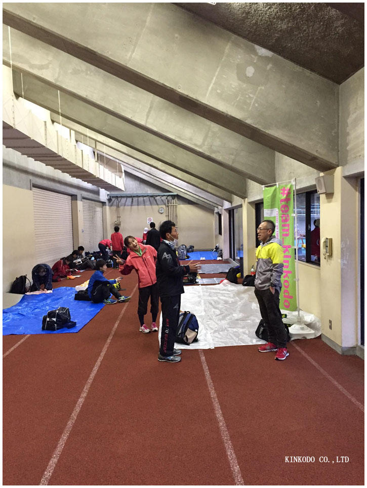 実は京都の脚腰を祀る護王神社の御守を店に忘れてきており、6時ちょっと自宅を出て、一旦店により御守をゲット。それから現地に向かいますが、西部緑地公園の入り口でまたもや渋滞。私は陣地取りの役目でしたが、私が到着したころには既に数名のメンバーが場所を確保してくれていました。まだ小雨が降り続いていましたが、屋内の走路は割と空いており、なんとか場所を確保。フラッグも立てて準備OK。