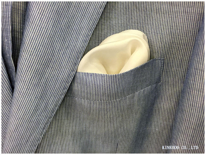 これは白のシルクのチーフを入れているわけですが、夏ですとシルク以外にもリネンとかのチーフも登場します。私の場合はこのように立体感を出してチーフを入れるのですが。時間が経つと。