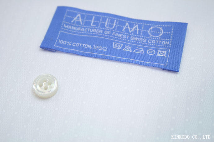 スイスのアルモ社の生地はどちらかというと、ソフトなタッチの生地が多く、また170番クラスの生地ですととにかく柔らかい。今回ご用意できたのが120番手の白ドビー生地。ソフトな肌触りと張りと腰を両立できるのがこれくらいの糸番手だと思います。