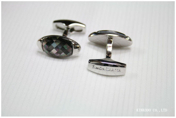 SIMON CARTER 【サイモン・カーター】楕円形蝶貝モザイクカフス(シルバー)です。¥11,880- 落ち着いた表情はフォーマルな装いにぴったりかと。