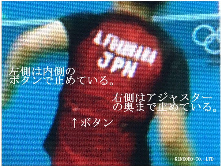 恐らくは左右にボタン二つを付けて、奥に止めれば、より強く絞れるし、手前のボタンに止めれば、絞りが弱いのだと思いますが、福原選手は全ての試合で、左右変わっているかは確認しておりませんが、右側は奥のボタンに止めて、左側は手前のボタンに止めて、絞りを浅くしております。