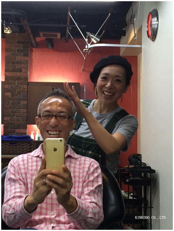彼女の腕は上がっている、ヘアスタイルは一緒、でも変わっているのは私の髪の毛の量。「かがやきカットです」光っているから?それもありますが、北陸新幹線にちなんで。