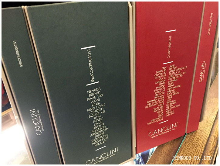 辞書のように見えますが、Canclini(カンクリーニ)社の生地スワッチです。この中に生地のサンプルが色々入っていて、そのサンプルを見ながら発注し、商社を通じてイタリアから送ってもらいます。