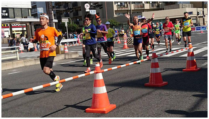 おそらくは、42キロの間に何人もに聞かれると思いますが、横に並んだときに、「裸足でフルマラソン走って、足裏に血豆とかできません?」と聞いてみました。「路面に引っ掛けない限りは大丈夫ですね」とのこと。金沢マラソンでも蟹の被り物して、裸足で走ったチームメイトがいましたが、彼は足裏にいくつもの血豆を作っていたので、裸足のランナーの鉄人ですね。この方。