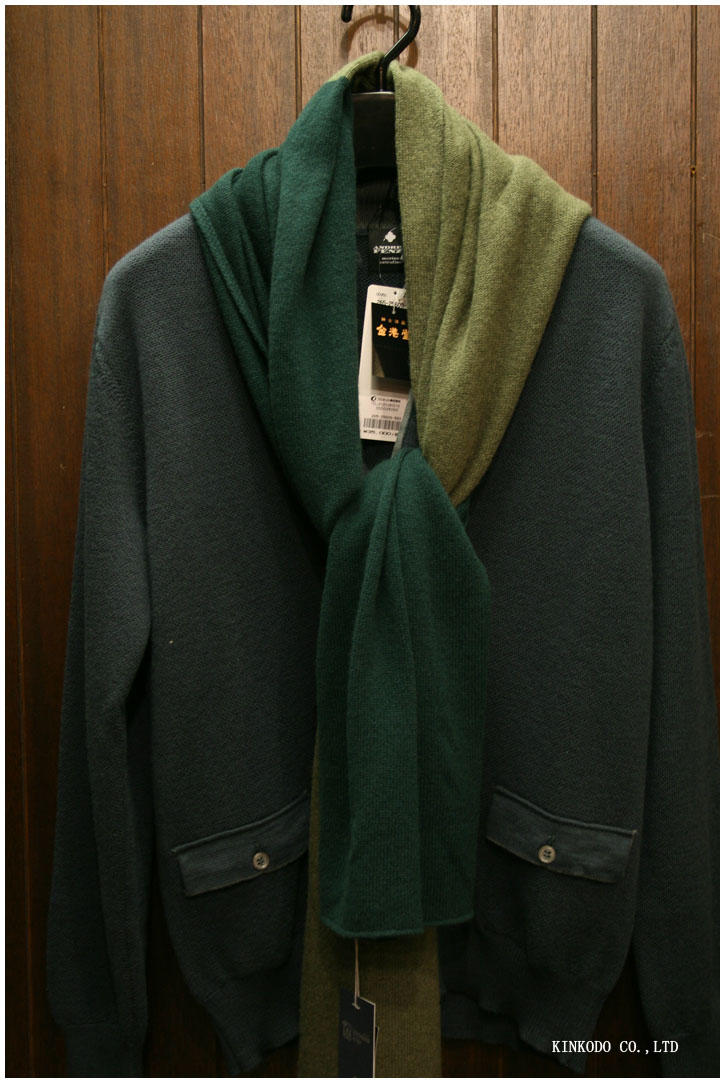 グリーン系のカーディガンにカシミヤニットのツートンのストールを合わせました、正直言うとディスプレイ映えしませんが、人が着ると上品なコーディネートになるかと思います。