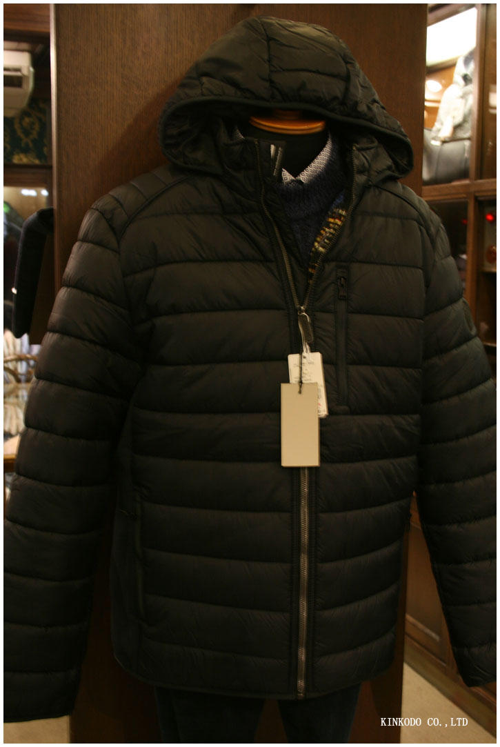 フード付きの中綿のブルゾン。着丈はそんなに長くなく、タイトフィット。両脇にストレッチ素材が入っていて、多少お腹の大きな方でも対応できます。