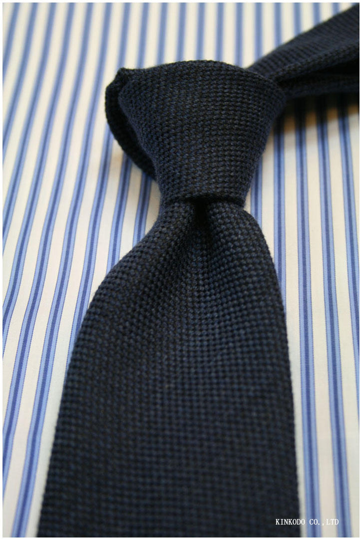 ブルーのストライプ生地に、バスケット調の織柄のウール50%シルク50%のタイを合わせてみました。ベースがストライプですので、無地のネクタイをコーディネートすることですっきり。