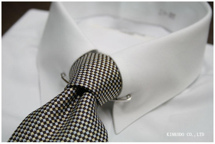 ピンホールの場合は、ピンホール用に穴を開けた衿のシャツにピンをさしますが、これは通常のレギュラーカラーのシャツでも大丈夫。ただ衿型が広がった、ワイド系のデザインのものには合いませんが。簡単にお洒落を楽しめます。
