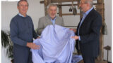 この色の組み合わせ、私好きなんです。ブルーとブラウン。昔だったら絶対に一つの生地の上で一緒にならなかった色合いですが、今は自然というか、これがトレンドみたいなところもあります。綿が65%とリネンよりも混紡率が高いので、シワも優しいシワになると思います。