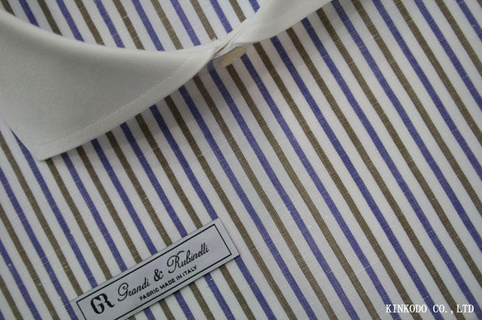 ブルー×ブラウンの綿麻ストライプ生地 イタリア・グランディ&ルビネッリ社製生地 綿65%麻35% です。リネン生地はこれまでも多数アップさせて頂いておりましたが、そろそろ本格的なクールビズに備えて綿麻の生地をアップさせて頂きました。