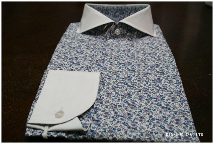 お客様から、掲載を承諾頂いておりましたので、アップします。花柄のプリント生地で、クレリック仕様。衿の首に当たる所と、カフスの裏側は、共生地のプリント生地。そして、衿はカッタウエイカラー(2)