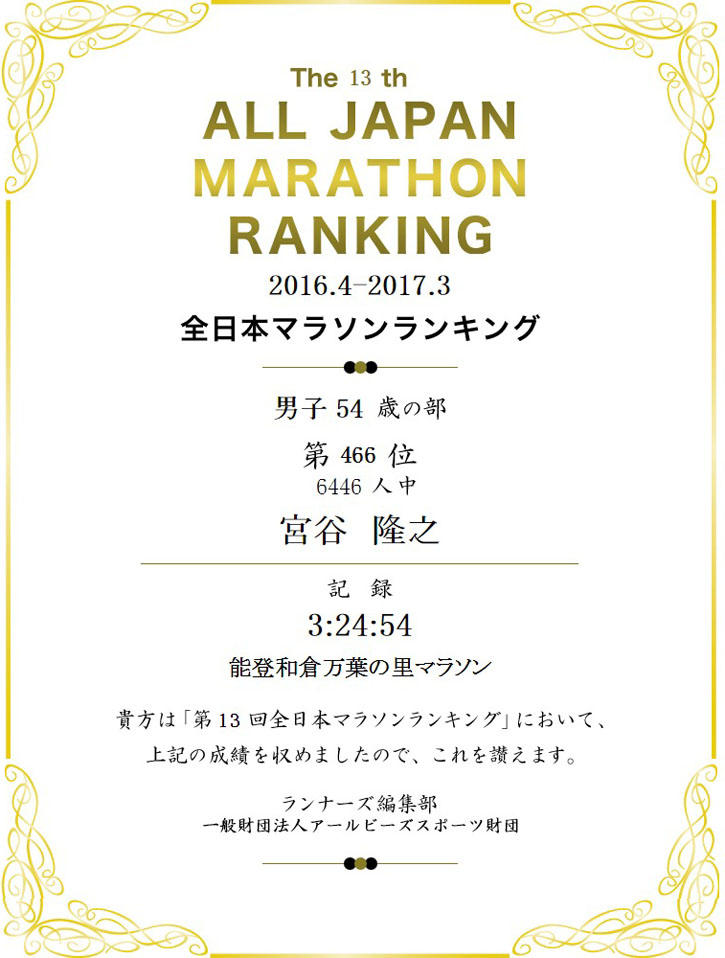 昨年の秋からのレースだとすると、金沢マラソンの前にぎっくり腰、その一週間後に大阪マラソンでしたが、水曜日に風邪をひいてしまい、その状態で大阪マラソン。タイムは上の能登よりちょっと悪いくらい。
