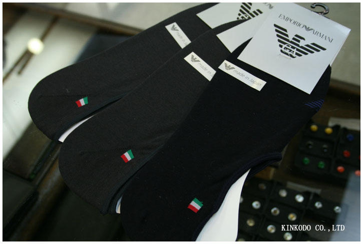 ビジネスの革靴にはロングホース(ハイソックス)しか履かないというこだわりがあると、このようなソックスには見向きもしないでしょう。でも、最近は革靴にも、このような靴下履きます。ARMANI(アルマーニ)¥1,300+税