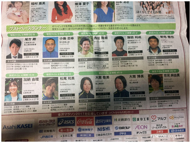 写真が汚くて申し訳ありません。先日新聞に掲載されていました、ゲストペースランナーです。詳細は上の写真をクリックして頂きますと、金沢マラソンのページにリンクしますので、そちらからご覧ください。