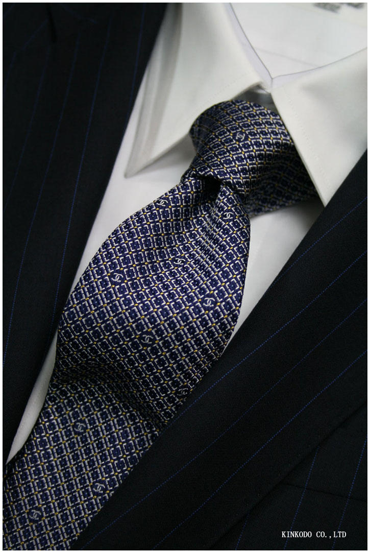 CHANEL シャネルのネクタイです。織りが深いというか、しっかりと細かく、織ってあります。ネイビーのスーツに品の良いネクタイ。拡大すると。