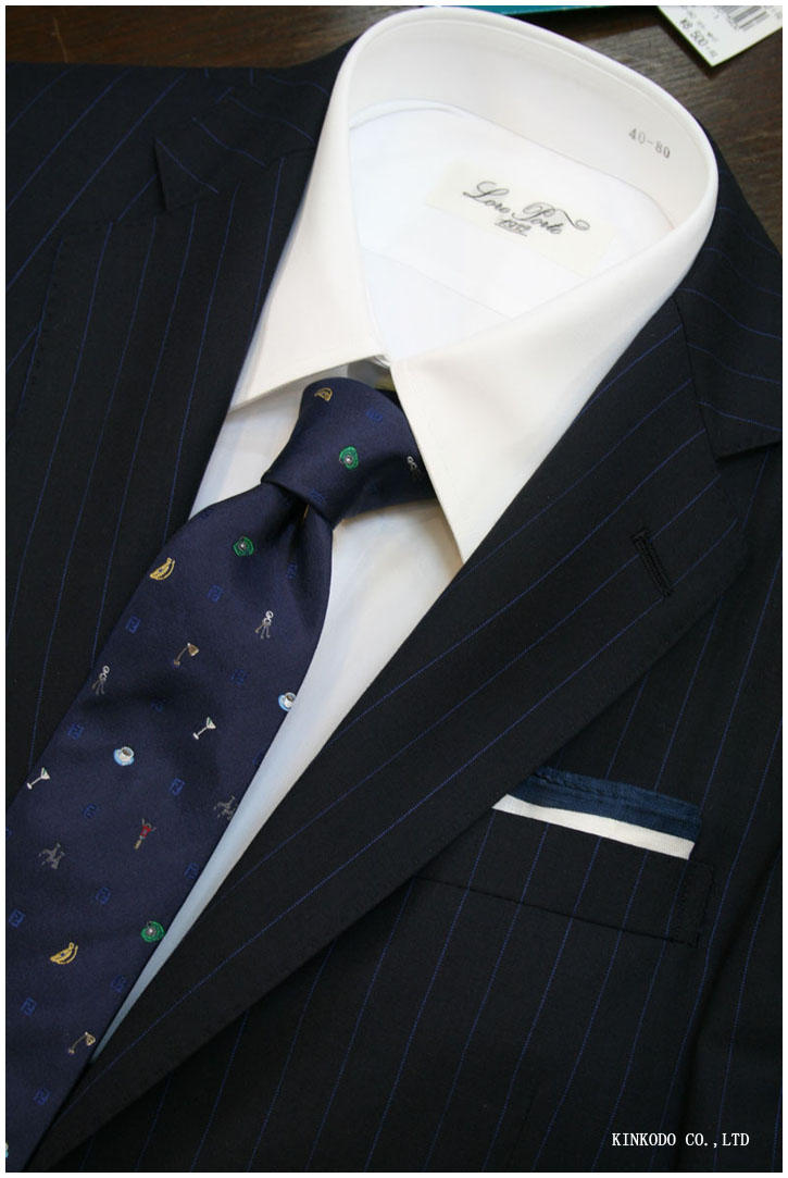 ネクタイ単体で見るとカジュアルというか、遊びに近いネクタイに見えますが、スーツにインして、チーフなどと合わせると、フォーマルやパーティーなどにも使える、シックなコーディネートになります。