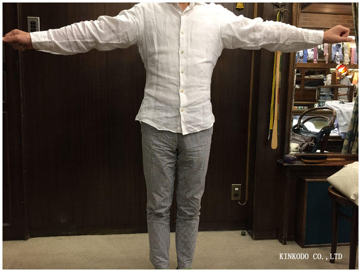 背筋はしっかりと伸ばしましょう。ホームページからのご注文の際にはパンツアウト仕様でとご記入ください。