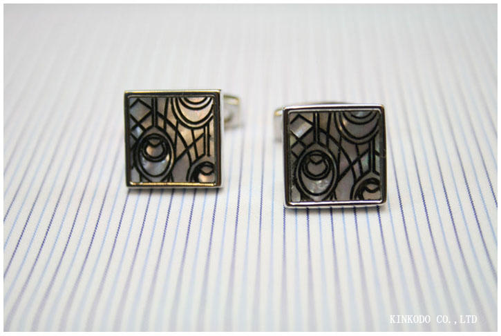 クジャクの羽根のカフスです。ベースの金具は真鍮で、中に蝶貝を埋め込み、クジャクの羽根を描いています。