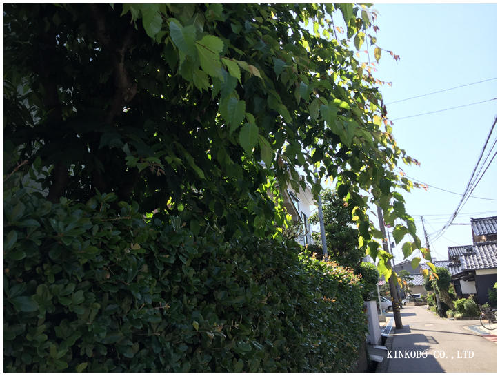 通行人に触れそうになるほど垂れ下がってきた庭木。何という名前の木か知りませんが、冬の間にはほぼ坊主にしてもらっているのですが、この時期になると、これくらいに伸びます。