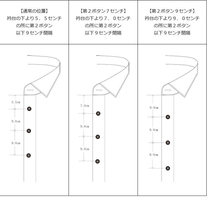 通常のボタン位置は第2ボタンが衿台から5.5センチに付いているものが多いのです。私は少し下げておりまして、7センチの所に第2ボタンをつけております。この説明をするのに、結局はネクタイを外して、シャツの空き具合をお見せするわけです。