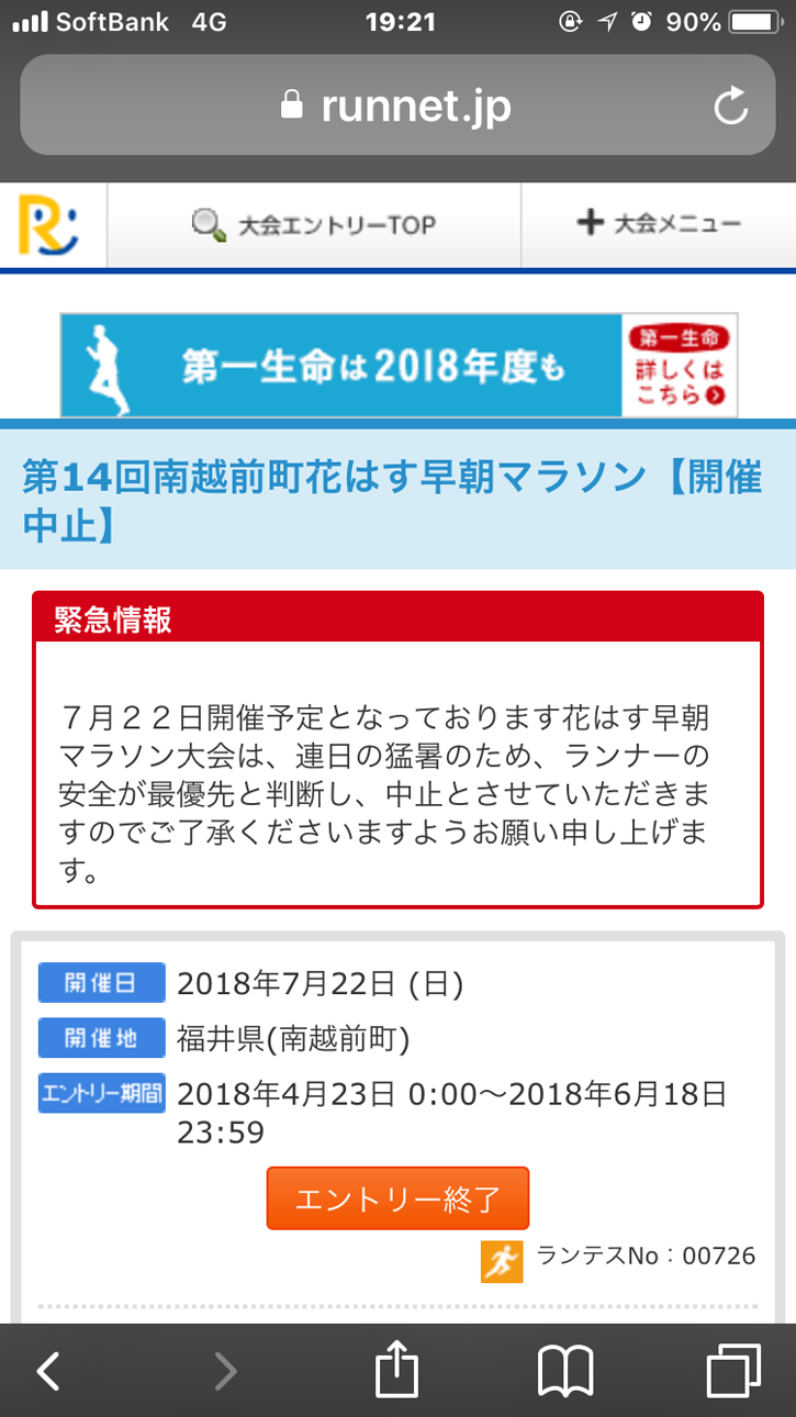 花はすマラソンは、一度膝の故障で応援だけということもありましたが、水曜日のインターバルは暑い中、そこそこ走れていたので、楽しみにしていたのですが、とても残念です。
