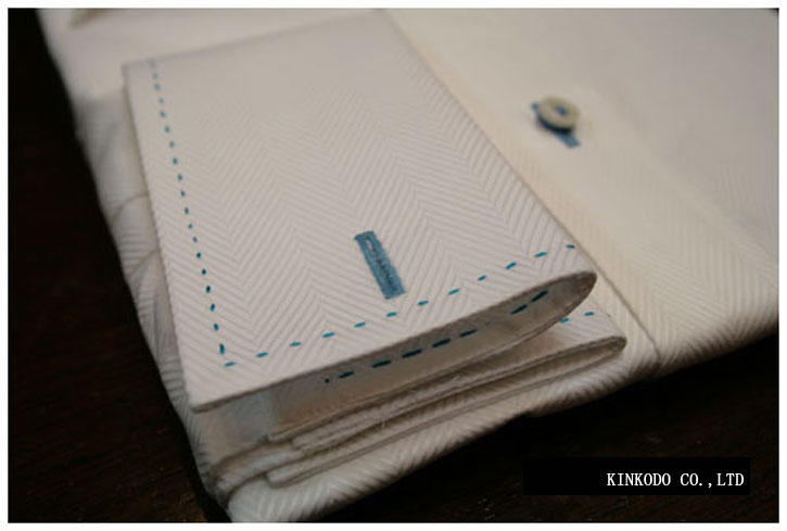 ダブルカフスにハンドステッチを入れて、そのハンドステッチの色と同じ色で、ボタン付け糸とボタンホール糸をかがってあります。既製品ではダブルカフスでハンドステッチを入れたものは見かけたことはないので、オーダーらしいデザインになるかと。