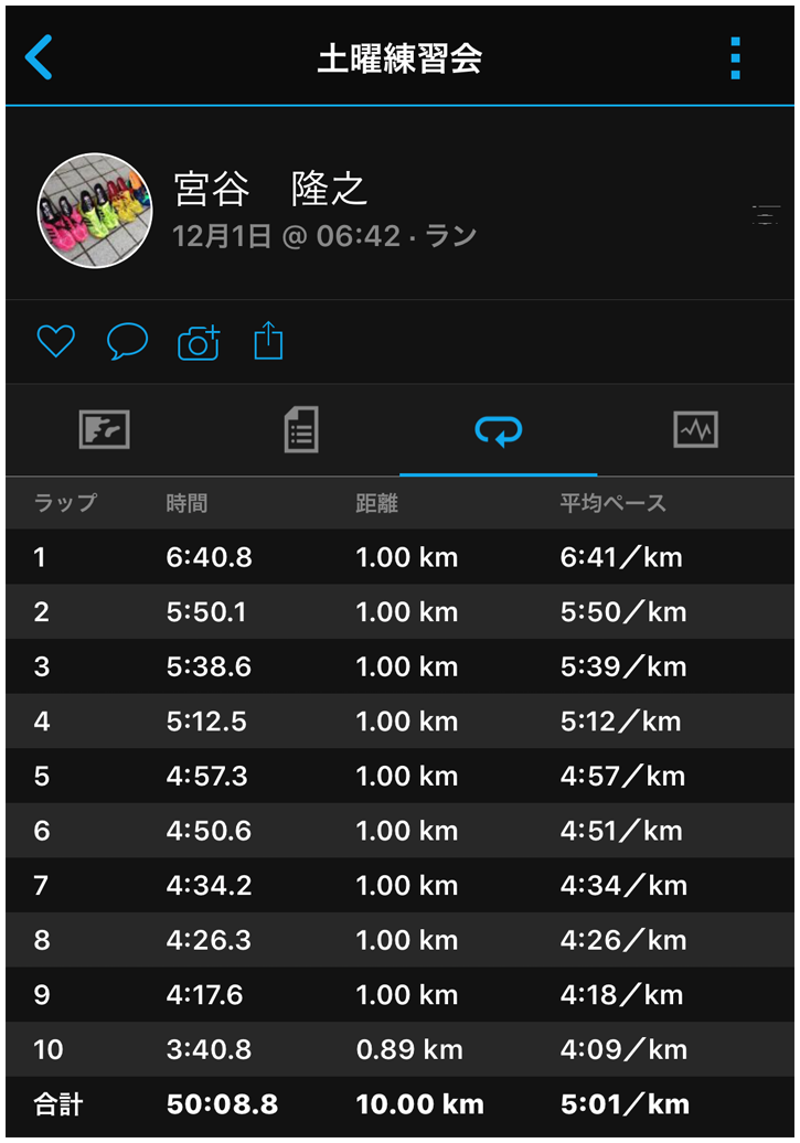 土曜の朝練はけっこうガチに走るので、ジョグでは終わりません。今日も終わらなかった。レース終わったしジョグね~~なんて言いながら、結局どんどんペースが上がっていき。今日も最後の1キロは4分10くらい。朝からきつい。