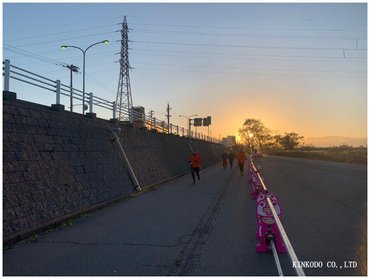 朝日をバックに河川敷12キロ。行きはサブスリーランナーの横で走ったので、どんどんスピードアップして、4分切るくらいまで上がって、往路終了。帰りはきつかった。