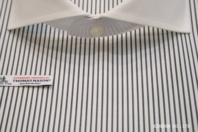 黒に近い濃いグレーの細ストライプ間はヘリンボーン ストライプ生地 イタリア・トーマスメイソン社製生地 綿100% お仕立て上がり¥18,000+税 ご注文お待ち致しております。
