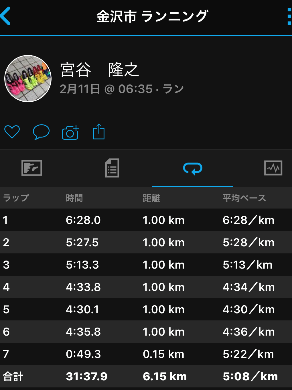 行きはよいよい帰りは怖い。という言葉がありますが、行きもだんだんとペースが上がります。ダムに向かう坂ですよ。4分半まで。私先頭走ってました。段々と自分もペースアップしている感じはしています。でも後ろからの足音は遠くならない。スピードを上がってきても、そして坂道が続いてもまだ後ろにいる。最後の急坂で離すことはできましたが、遅れて上がってきて「これじゃ能登は駄目だ」と行って、一旦戻ってまた坂を上ってくる。恐るべしメンバーです。