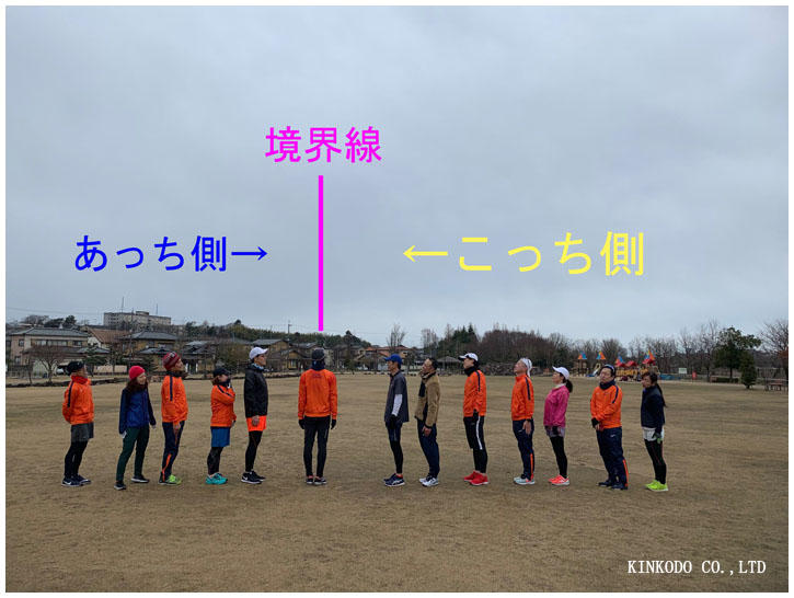 それで、あっち側とこっち側に分かれて写真撮影。私も先日の能登万葉の里マラソンで、あっち側にいくところでした。境界線は4時間を意味します。サブフォーか4時間切れないかの境。