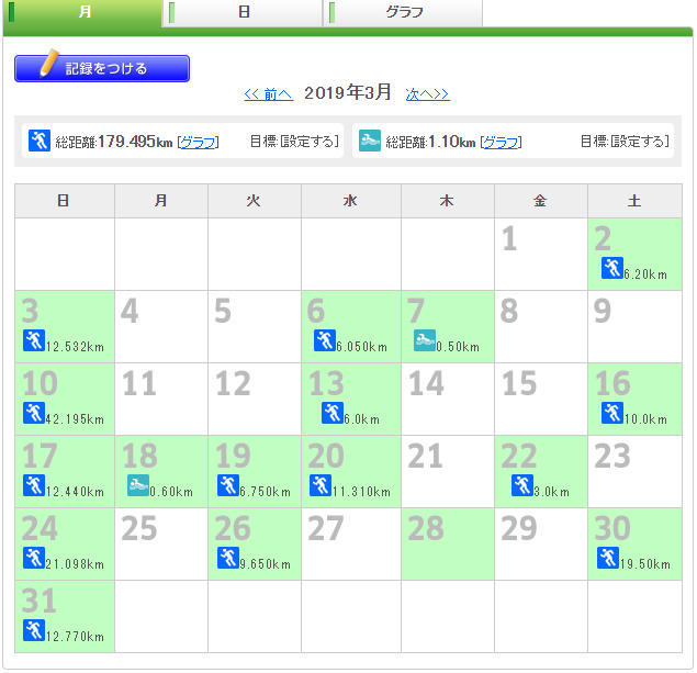 2日ほど500メートルとか600メートルとか泳いだ日はありますが、走ったのは、フルマラソン1本とハーフマラソン1本入れても179キロ。走った日は14日。つまり2.2日に1回くらいしか走っておりません。そんなに走れませんって、仕事したら。