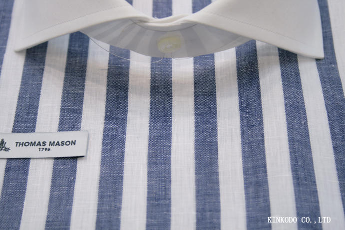 オーダーシャツ生地トーマスメイソンの1センチ巾のロンドンストライプリネン生地入荷しました。