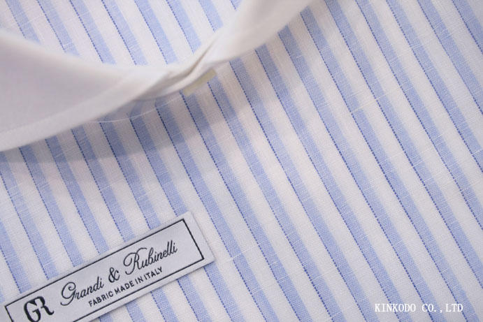明るいブルーのストライプの横にネイビーの細ストライプ イタリア・グランディ&ルビネッリ社製生地 麻100% お仕立て上がり¥20,000+税 ご注文お待ち申し上げております。
