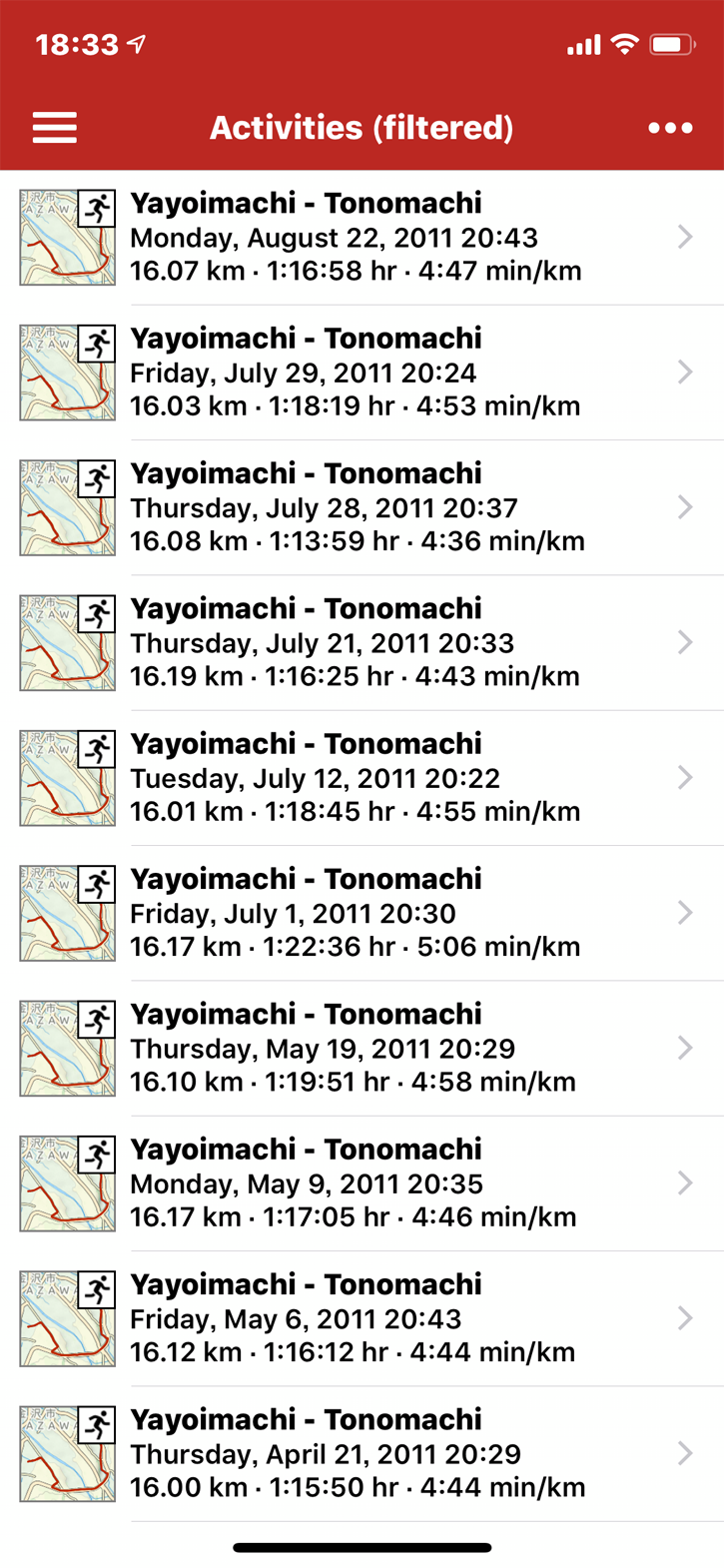 今ガーミンの中に入っている記録の中で2011年の4月が最初で32回同じコースを走っておりました。一番最初に走った時は1時間15分50秒 キロ4分44秒ペース。
