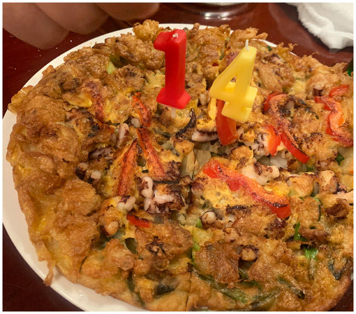 海鮮チヂミの上に1と4のろうそく。とうとう東京マラソン14年連続落選をお祝いして貰えるようになりました。