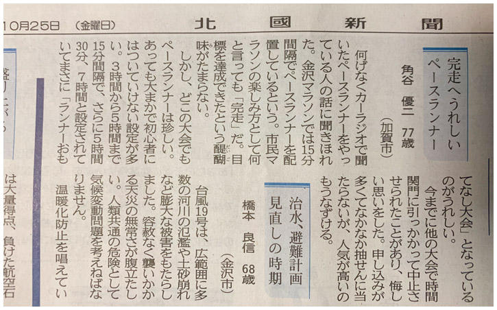 朝チームメンバーから今朝の北国新聞地鳴りに「ラジオでペースランナーをやってる人の話しに聞き惚れた」って投稿見ました。と連絡がありました。