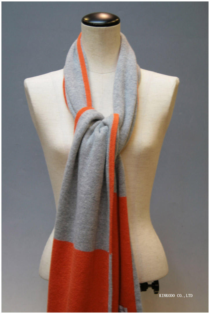 オレンジとグレーのパネルのストール。色合いから言うとレディースぽいですかね。私なら平気でしますが。