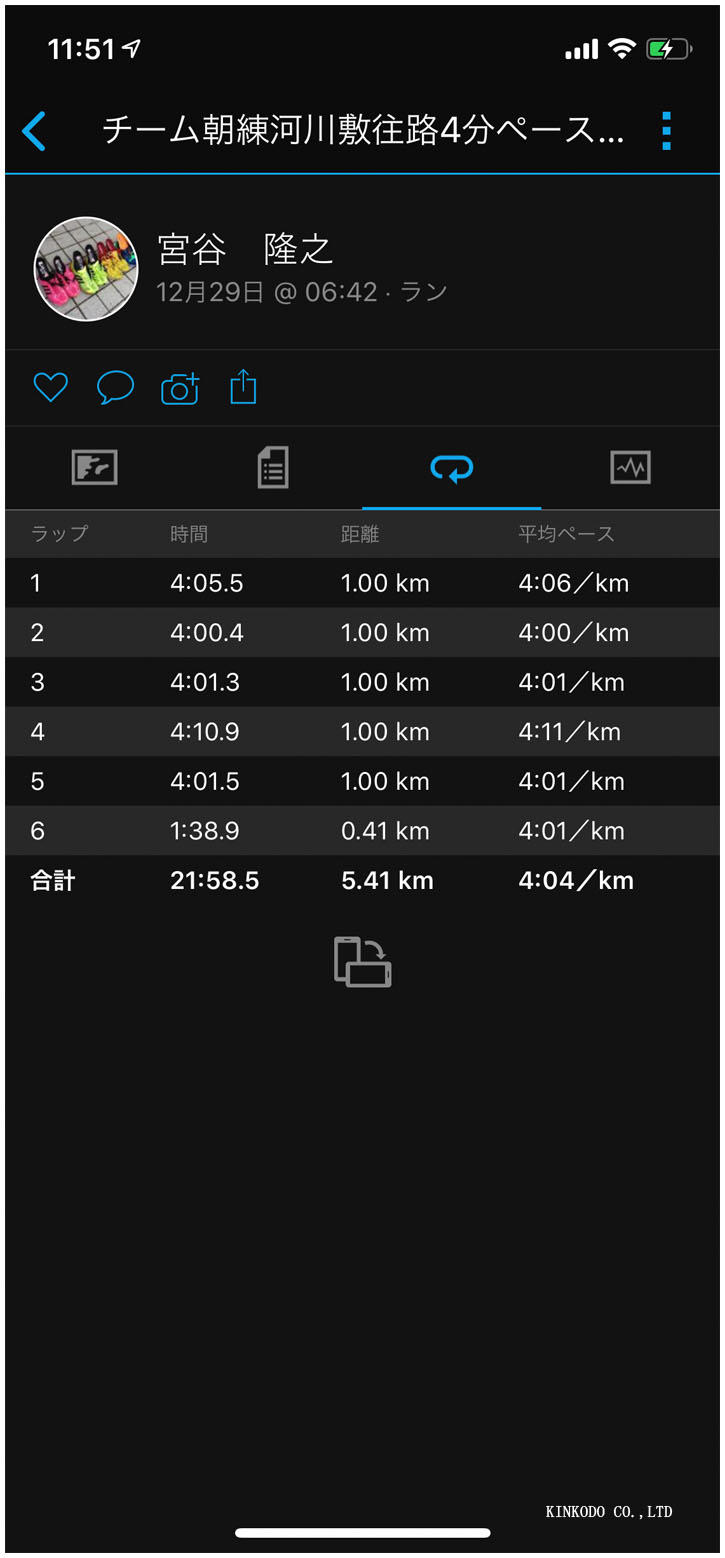 時計見たら4分5秒。早すぎやろ。次のラップ4分ジャスト。早いって、その次のラップ4分1秒。落とせや!でここで数メートル離されたところで、止めたくなって立ち止まりかけたら後ろからBジョーさんに抜かれた。このままでは終われないと思い、更に追いかける。次のラップは4分1秒まで戻すのに、更に遅れて最終的には50メートルほど離されたか?朝の6時半!君たちおかしいって。