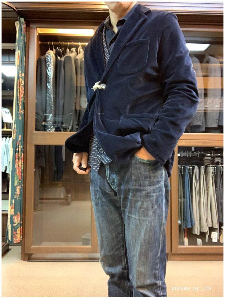 GuyRover(ギ・ローバー)のベルベット素材のジャケットです。シャツメーカーですので、作りは至ってシンプル。私の年代でもむかしこのような素材感のものが流行しましたが、今ではかなりソフトになり、そしてストレッチ素材です。タイトシルエットで、袖も細めにできております。